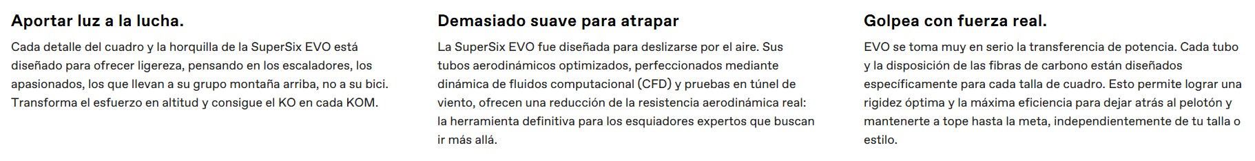 - Cuadro SuperSix EVO Gen 5 ultraligero y de baja resistencia aerodinámica. Carbono Serie 0: nuestra construcción más ligera y avanzada hasta la fecha.