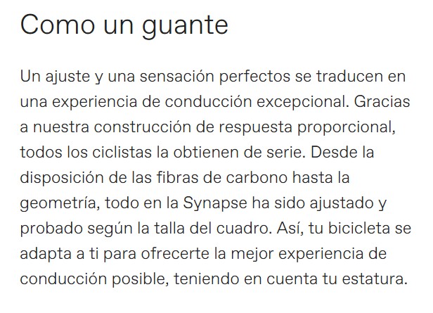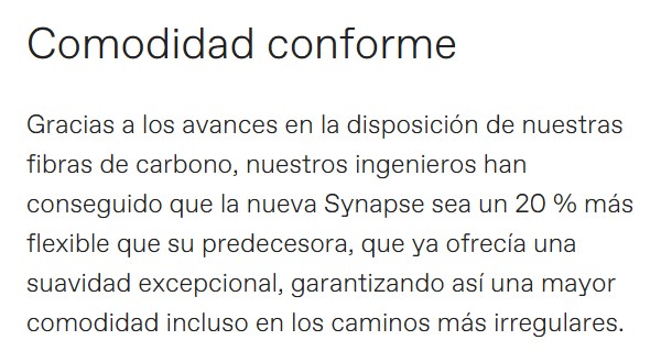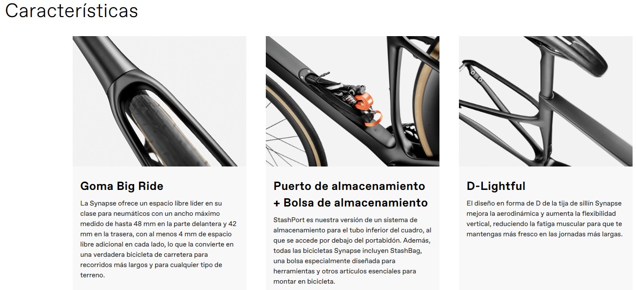Sencillas especificaciones Máximas prestaciones La Synapse Carbon 5 destaca por su alta comodidad y alta versatilidad en carreteras reales, y por un montaje más asequible: cambios mecánicos Shimano 105, cuadro de carbono y amplio espacio para neumáticos anchos. Ya sea tu primera bicicleta de nivel -o tu decimoquinta-, esta bicicleta te sorprenderá, porque sabe cual es el secreto: llevar la bicicleta adecuada puede marcar la diferencia.