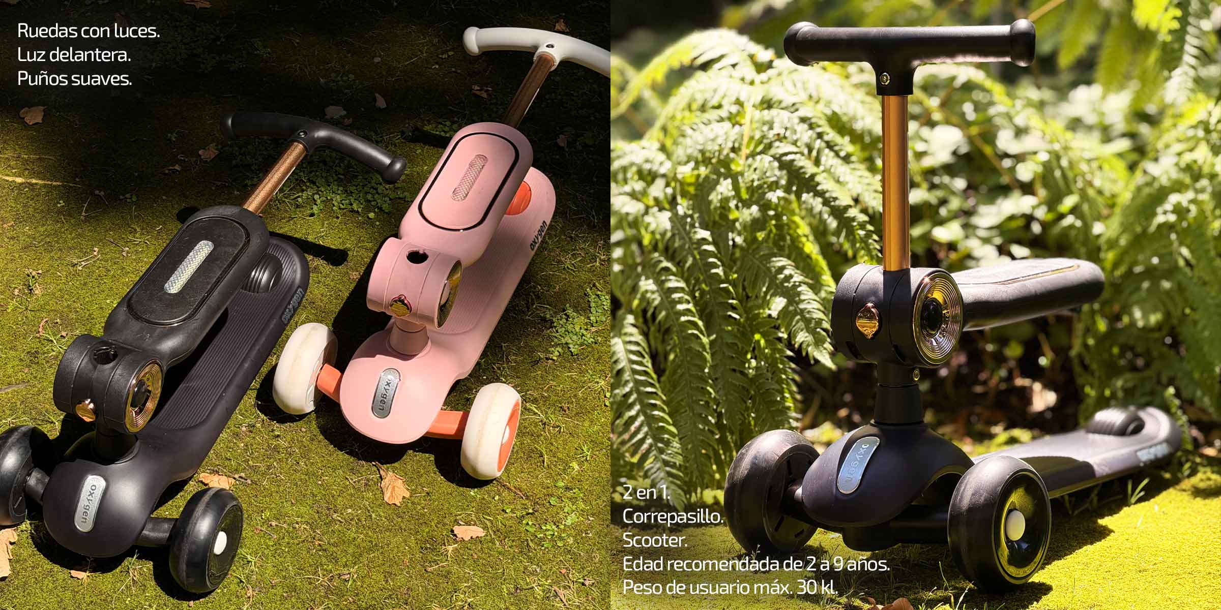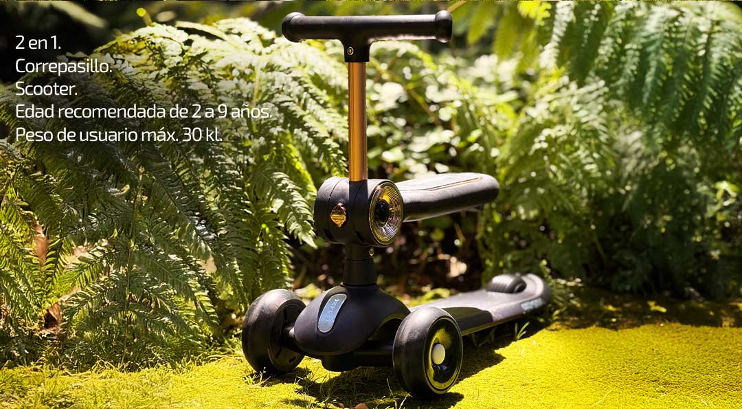 Scooter 2 en 1 con asiento abatible. Funciona como correpasillos y scooter. Ruedas con luces, puños suaves y estructura PP + aluminio. Ideal desde los 2 a 9 años.