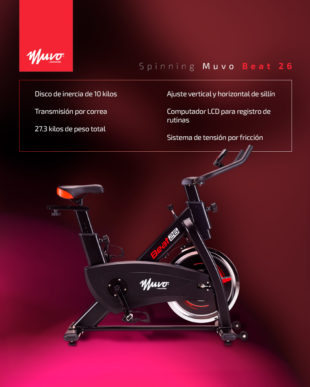 Calidad Muvo Fitness: Respaldada por la reconocida calidad de Muvo Fitness By Oxford, la Bicicleta de Spinning Beat 26 es un testimonio de nuestro compromiso con la excelencia tanto en forma como en función.